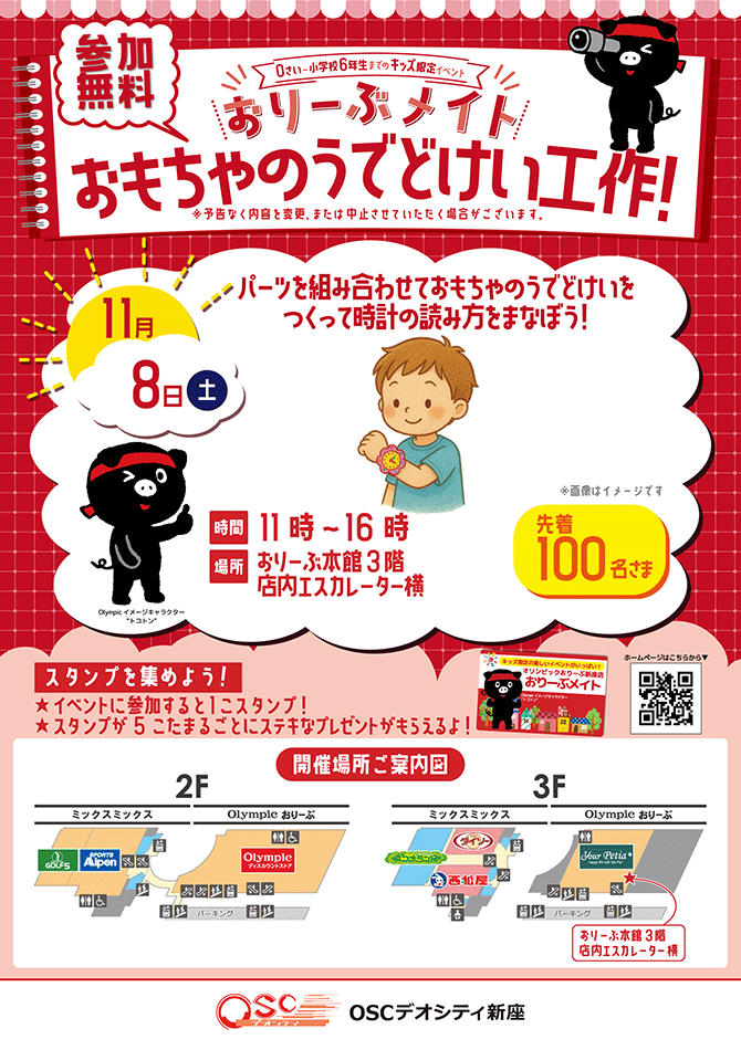 小学生までのキッズ限定イベント・おりーぶメイト、次回は「おもちゃのうでどけい工作!」を開催!