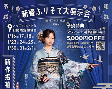 新作衣装入荷!! 1月16日から2月1日までの(金)(土)(日)に、新作振袖大展示会を開催いたします! レンタル価格より最大なんと10万円OFF!! さらに早期ご成約特典として、成人式当日のヘアセットと着付けが無料!!! 2027年ご成人の方は、あとわ…続きを読む