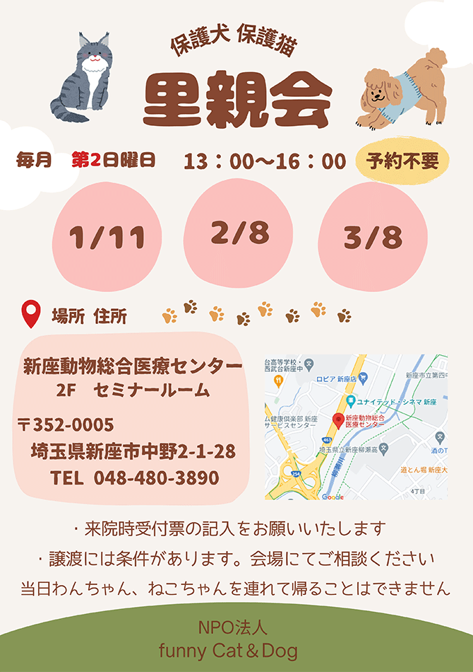 新座動物総合医療センターでは、毎月第2日曜日に、保護犬と保護猫の里親会を開催いたしております。