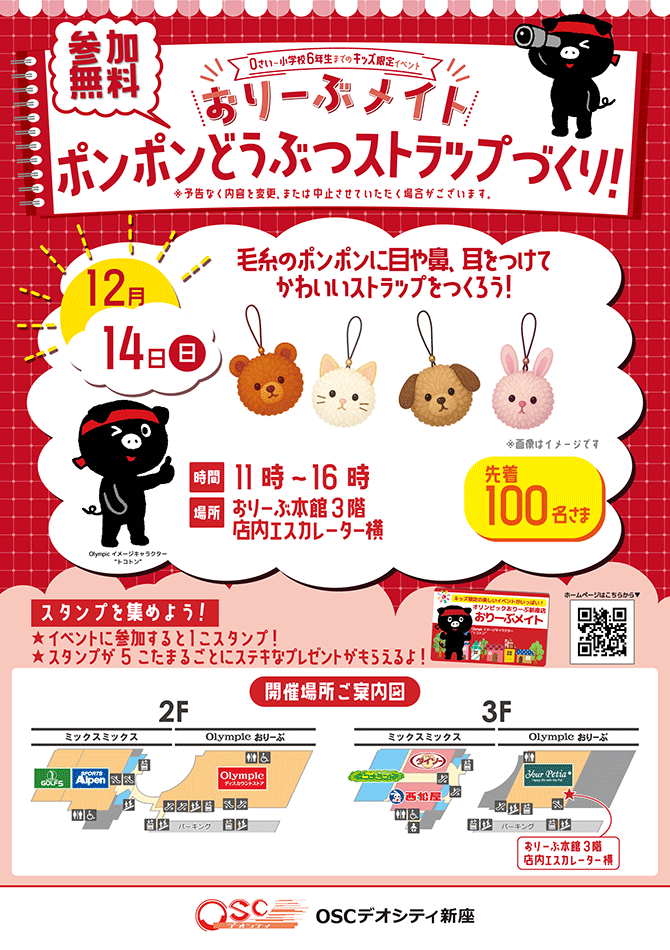 小学生までのキッズ限定イベント・おりーぶメイト、次回は「ポンポンどうぶつストラップづくり!」を開催!