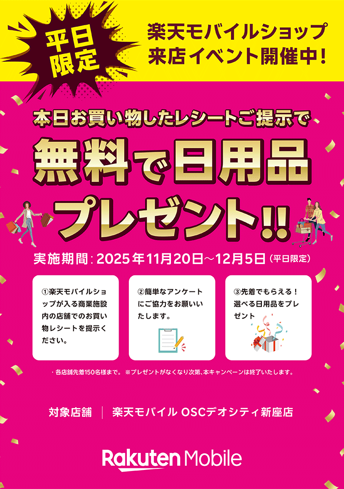 OSCデオシティ新座内の店舗で当日お買い物したレシートを、楽天モバイル店頭でスタッフにご提示いただき、簡単なアンケートにご協力いただいたお客さまに、選べる日用品を先着でプレゼントします!