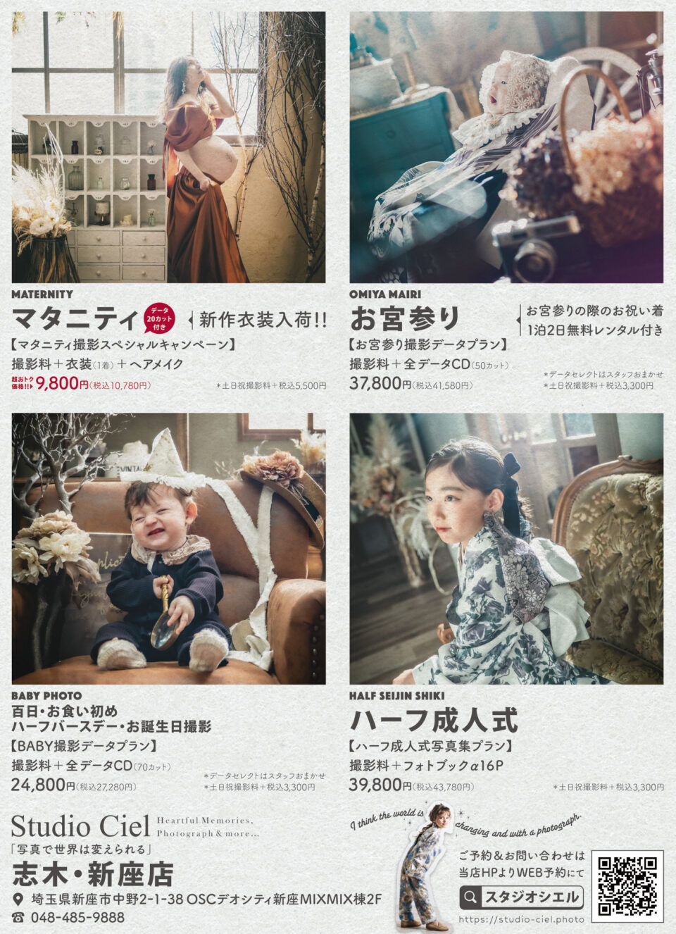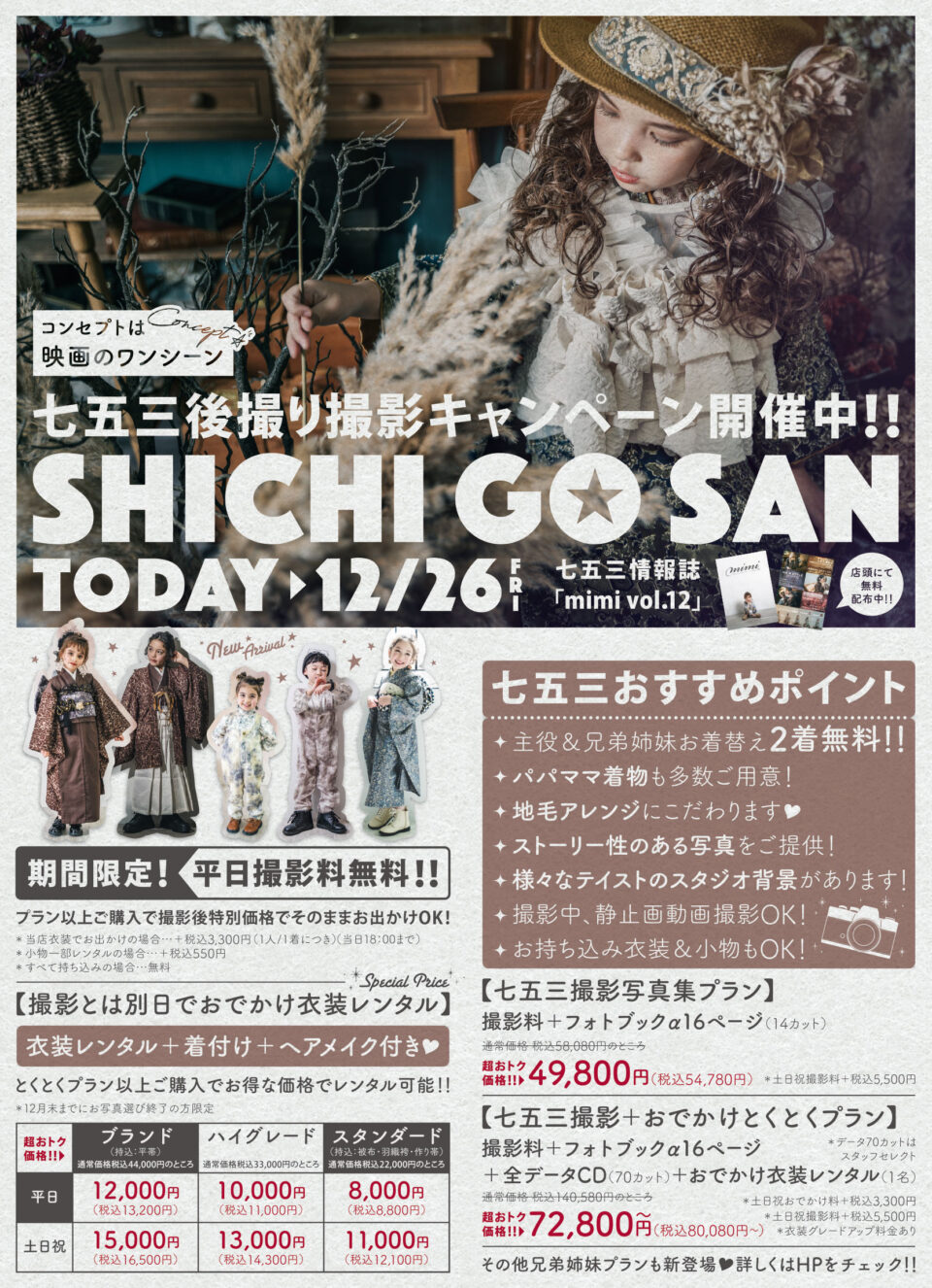 12月26日(金)までの期間限定で、撮影料+衣装代+着付け+ヘアメイク=通常9,800円~39,800円・・・が、なんと無料!!